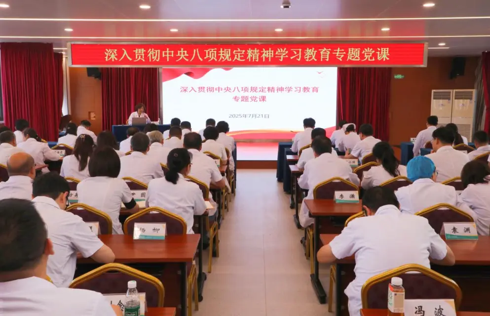根据深入贯彻中央八项规定精神学习教育工作安排,7月21日下午,我院党委书记束一平以“锲而不舍落实中央八项规定精神,以作风建设新成效护航医院高质量发展”为题,为院领导班子成员、职能部门负责人、临床医技科室负责人、党总(支)部书记、病区负责人及科护士长讲授专题党课。