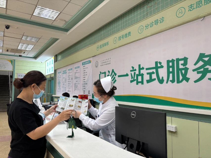 清晨,门诊大厅便洋溢着节日温馨。门诊一站式服务中心护士与社工志愿者热情地为前来就诊的患者及家属送上中医科特制的端午香囊,传递安康祝福。志愿者们还同步发放中医养生宣传册,普及健康知识,让关怀更添实用价值。