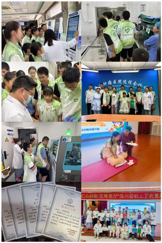 活动中,孩子们先后参观了门诊大厅、检验科、远程会议中心、中药房、供应室和临床肿瘤实验中心等科室,近距离了解医院医疗相关工作。午休期间,孩子们集体观看了电影《雄狮少年》,同时主动参与才艺展示。当天下午,我院ICU青年文明号集体为孩子们带来急救知识培训,孩子们通过“眼睛看,耳朵听,手上做”学习和练习了心肺复苏和海姆立克急救法。