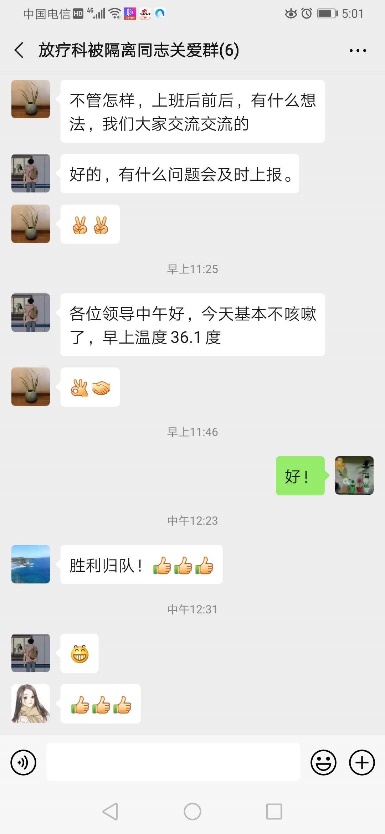 微信平台等宣传载体向全科职工传达防控措施,提高防控意识,让防控知识深入人心,认真组织排查并做好隔离防控工作。放疗技术中心技士小孟回老家期间与武汉归来同学有接触,立即向科室做了汇报并按要求在家隔离14天,此间,放疗党总支、放疗第三党支部、放疗分工会以及科室领导、病区护士长和小孟建立了疫情防控点对点关爱小组,并建立了放疗科被隔离同志关爱