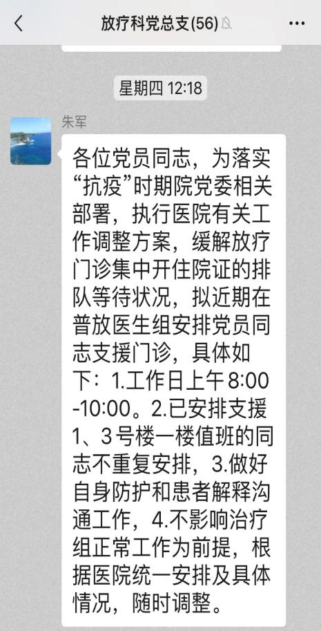 放疗党总支落实院党委的工作部署,及时召开党(总)支部书记、支委、党小组长会议,传达上级党委精神,通报全院抗疫工作开展情况,进一步把医院精神传达到每位党员
